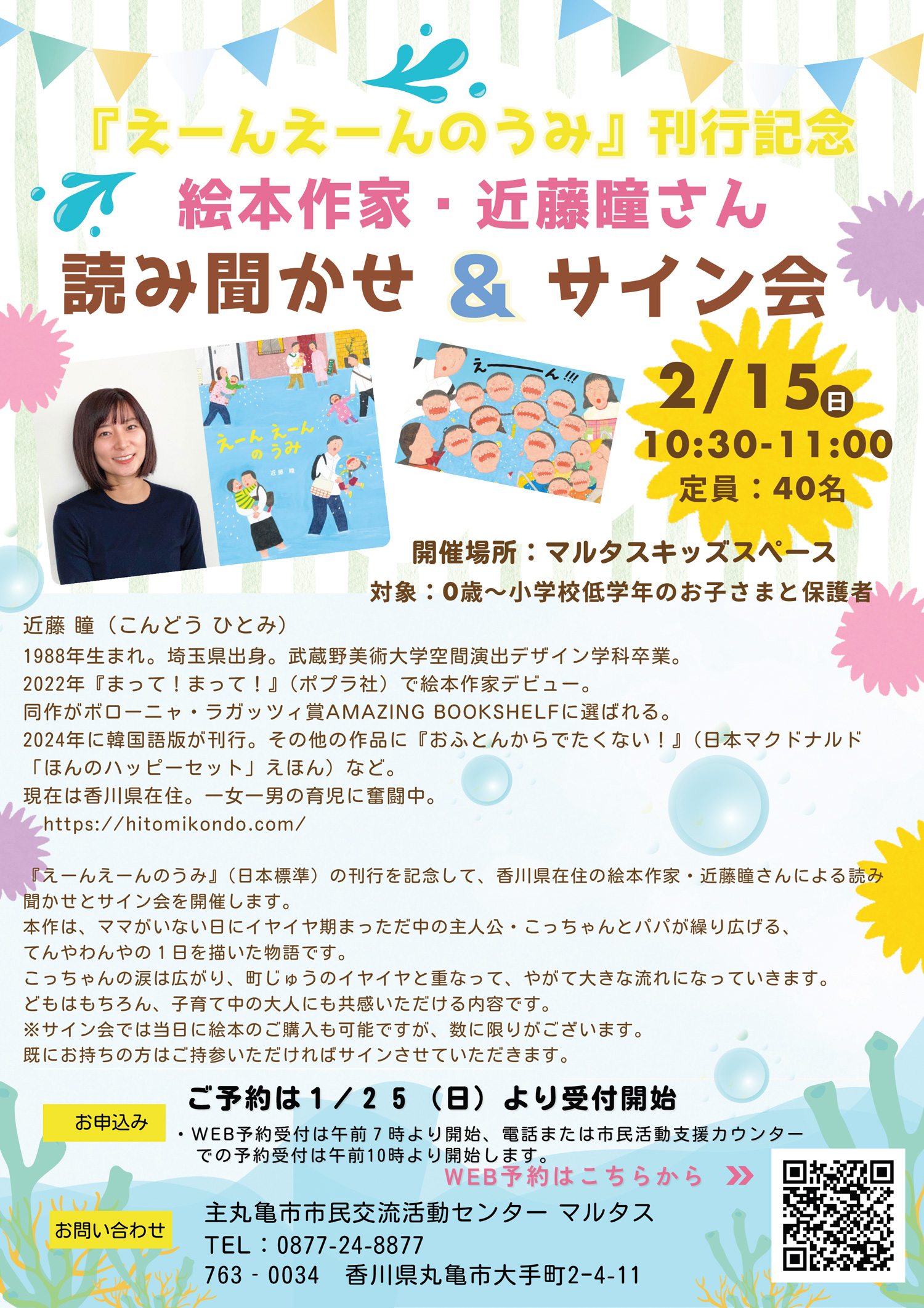 『えーんえーんのうみ』刊行記念として、丸亀市市民交流活動センター マルタスにて読み聞かせ&サイン会を開催します。