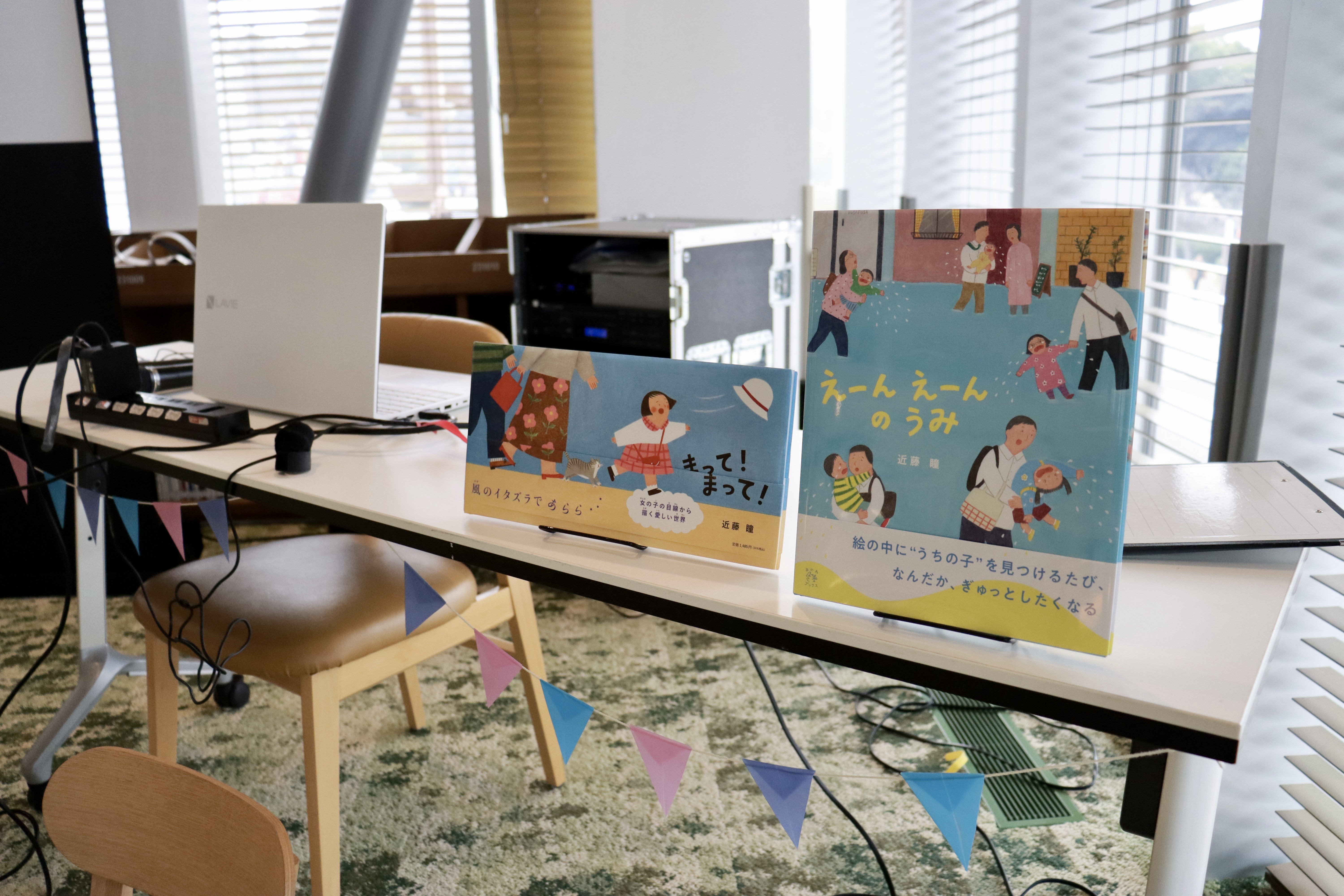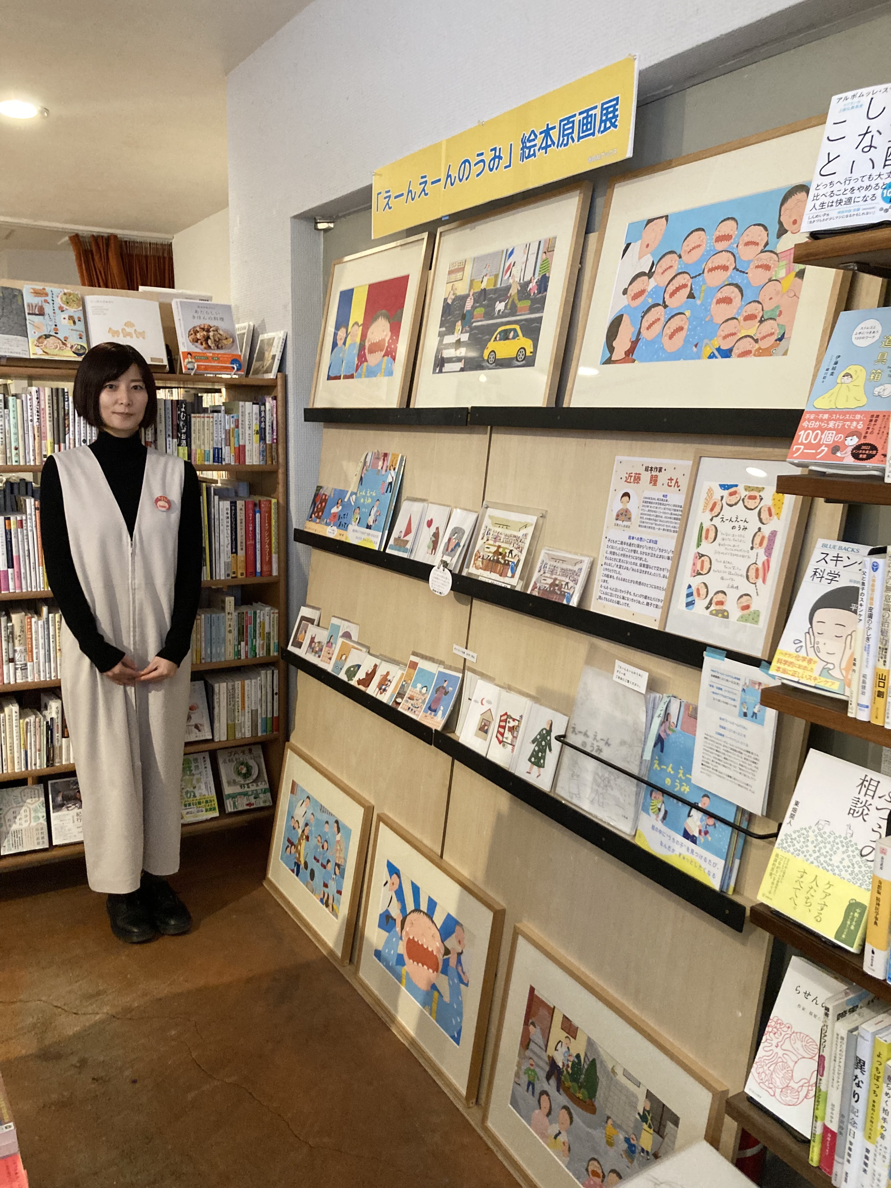 熊本県の長崎書店にて原画展を開催していただきました。『まって!まって!』の原画以外にも額絵を展示したりポストカードを販売してもらいました。書店員さんが作ってくださった店頭ディスプレイがとても素敵でした。私も現地に赴き在廊して書店員さんとのトークイベントと工作ワークショップを行いました。